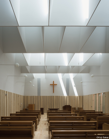 この場所の環境と合理の帰結として形がもたらされ、その存在を人々に印象づけることは、この教会をより多くの人に開いていくことに通ずる。教会の中に進めば、礼拝堂の上から満たされていく光は、時に強く、時にはかなく、分け隔てなく人々を照らす。