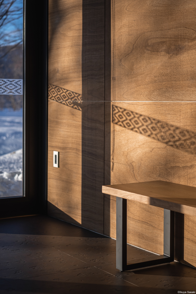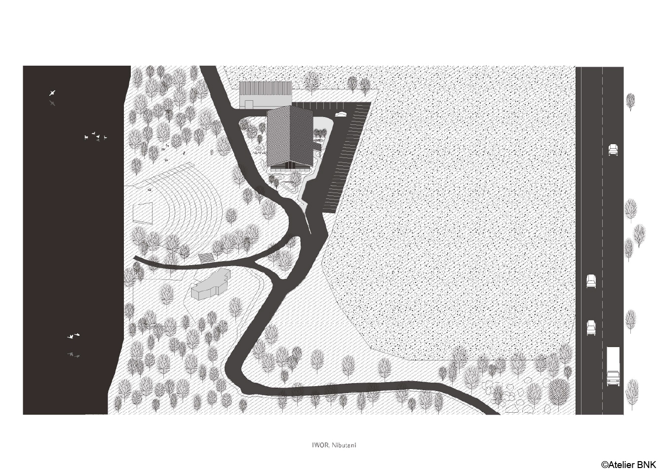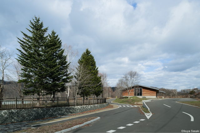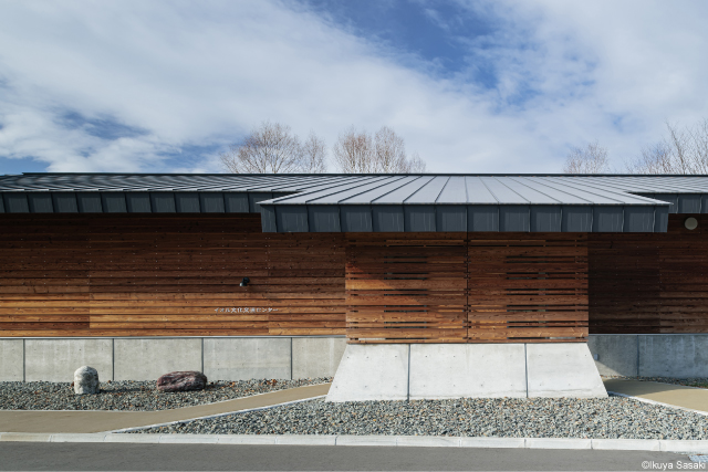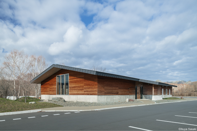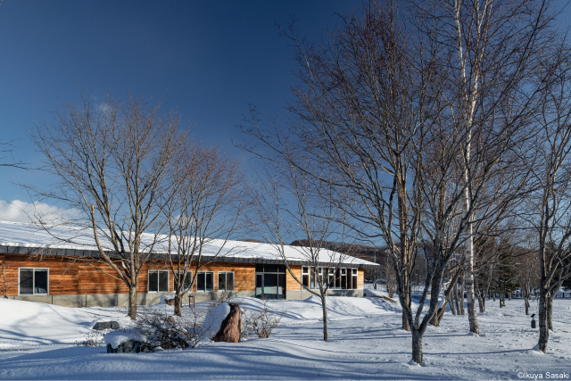日高地方の平取町二風谷はアイヌ文化が長年育まれてきた地区であり、今もアイヌの伝統が色濃く残る。計画地周辺には、アイヌ文化博物館を中心に、アイヌの住居(チセ)等、アイヌ文化や歴史に触れることができる施設群が豊かな自然環境の中点在している。当施設は、アイヌの工芸品の技術伝承を目的とした複合施設であり、修学旅行生の舞踏体験等に利用する「交流室」、伝承者育成事業の研修拠点となる「研修室」、民具製作等を行う「作業スペース」などからなる木造平屋である。