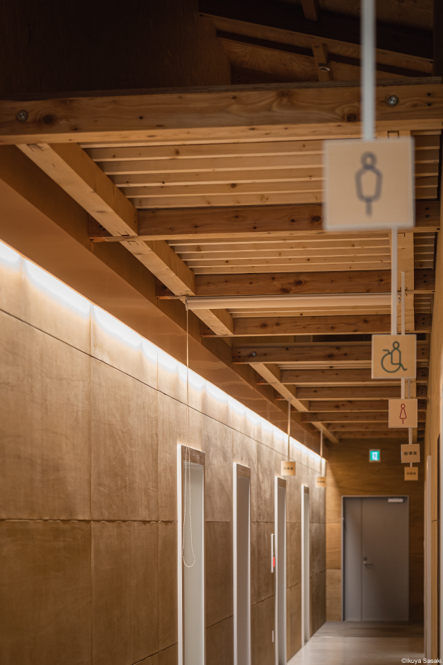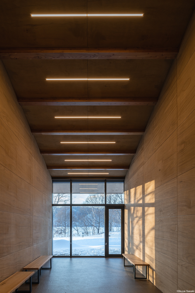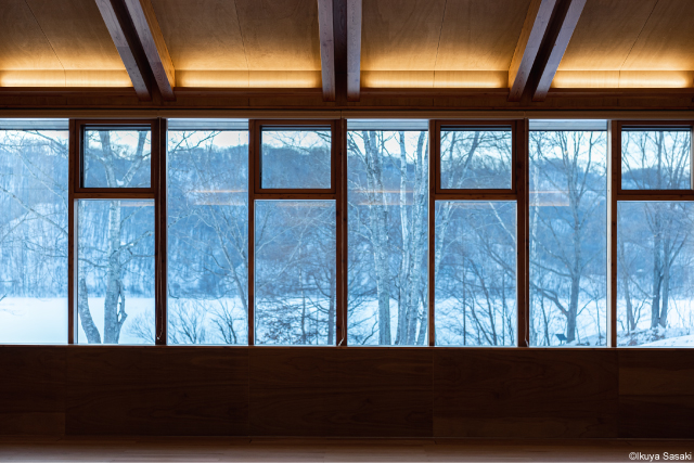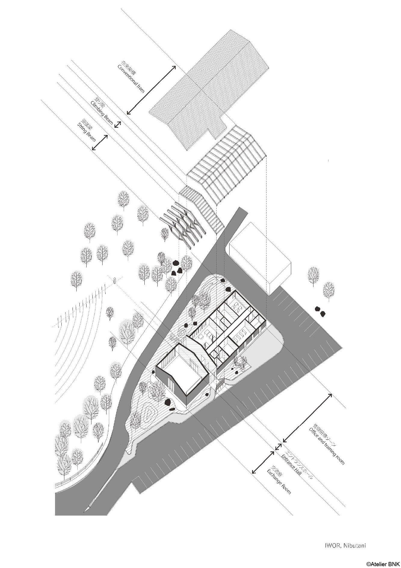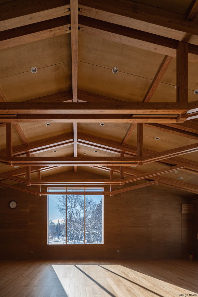 適材適所の木架構からなる交流室、エントランスホール、管理研修ゾーンの3つの機能がパラレルに連結しシンプルな長方形平面(4.5m×38m)を成す。交流室には、14.5mスパンの無柱空間となる張弦梁を架けた。借景となる沙流川の景色が広がる大きな気積のエントランスホールは登り梁を0.91mピッチで並べリズミカルな表現とした。管理研修ゾーンは、住宅スケールの空間となるため、3.2mの高さに中間桁梁を設け、柱の座屈長さを短くし木造住宅と同等の材で構成した。多様性のある架構の下に異種プログラムがパラレルに連結し一枚屋根で統合した。